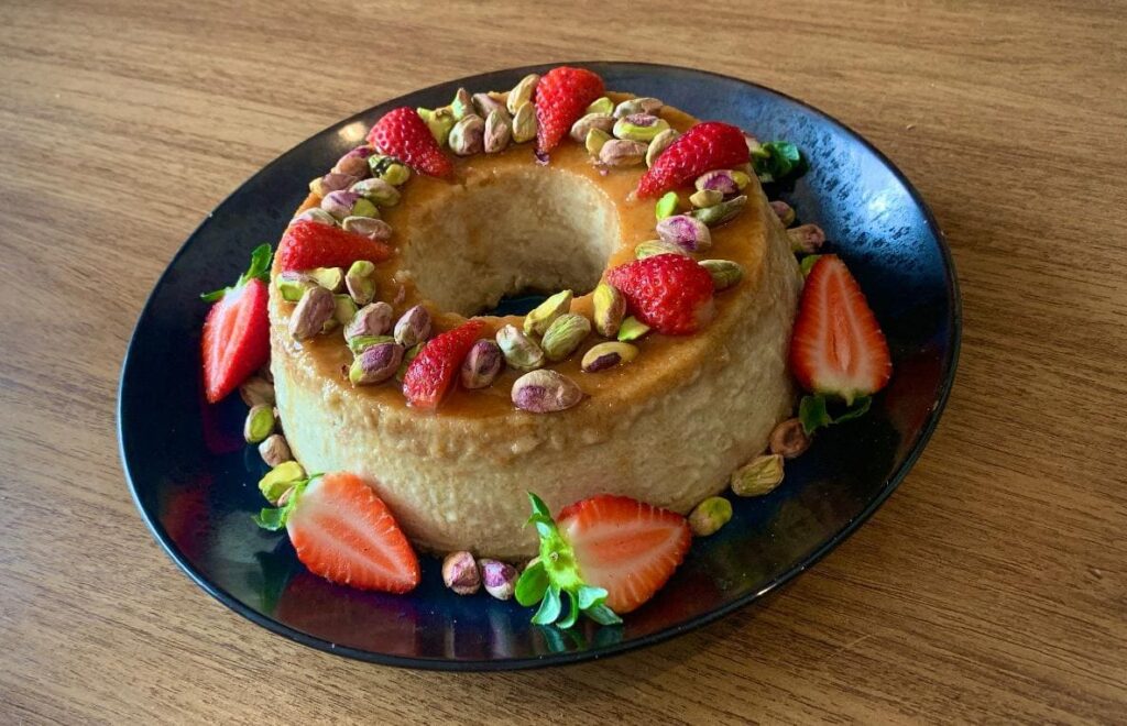 - Finalização: deixe esfriar, leve à geladeira por 6 h, desenforme e finalize com pistache, calda e morangos.